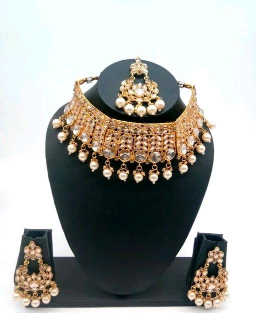 Chic gold plated alloy jewellery set is perfect to team with matching costumes. The design of this artificial stones & beads necklace, earrings & maangtika is unique and adjustable.