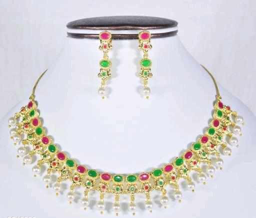 Artificial Stones jewellery set is perfect to team with matching costumes. The design of this gold plated necklace & earrings is unique and adjustable.