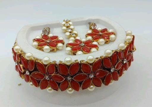 Classic Designer Maroon Women's Jewellery Sets Traditional jewellery set is perfect to team with matching costumes. The design of this artificial stones necklace earrings maangtika is unique and adjustable. Features Base Metal: Alloy Plating: Gold Plated Stone Type: Artificial Stones Sizing: Adjustable Type: Necklace Earrings Maangtika