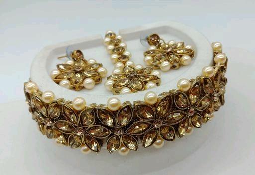Classy Designer Women's Jewellery Sets Traditional jewellery set is perfect to team with matching costumes. The design of this artificial stones necklace earrings maangtika is unique and adjustable. Features Base Metal: Alloy Plating: Gold Plated Stone Type: Artificial Stones Sizing: Adjustable Type: Necklace Earrings Maangtika