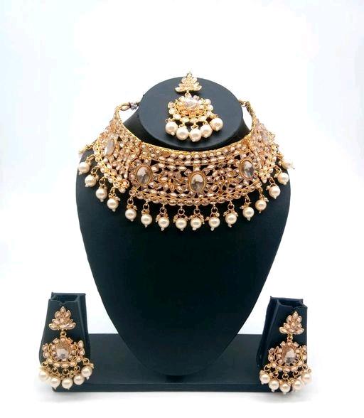 Elegant gold plated alloy jewellery set is perfect to team with matching costumes. The design of this artificial stones & beads necklace, earrings & maangtika is unique and adjustable.