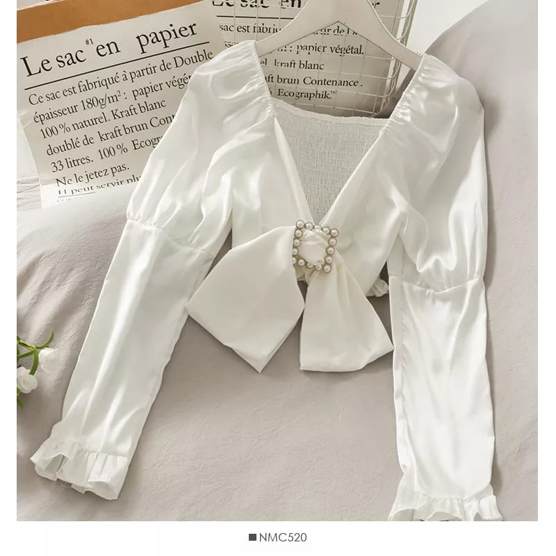 Sexy Deep White V-Neck Women Long Sleeve Crop Top This Sexy Deep V-neck Blouse Shirt Women Long Sleeve French Romantic Bow Design Crop Top. Made of Blended fabric, this top for women is quite comfortable to wear. Offering a desired fit, this top will keep you relaxed all night long. Features Fabric: Blended Length: 9 inch Type: Stretchable Crop Top Size:30 32 34