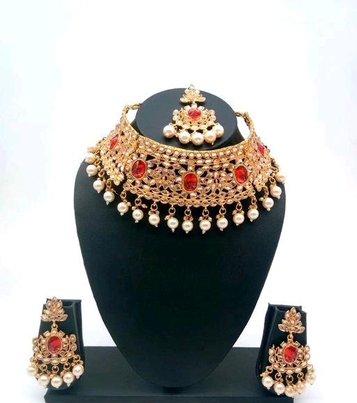 Stylish gold plated alloy jewellery set is perfect to team with matching costumes. The design of this artificial stones & beads necklace, earrings & maangtika is unique and adjustable.